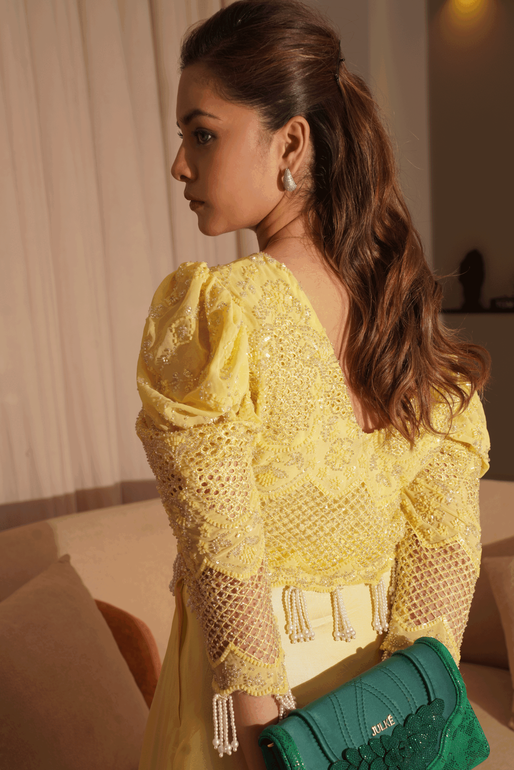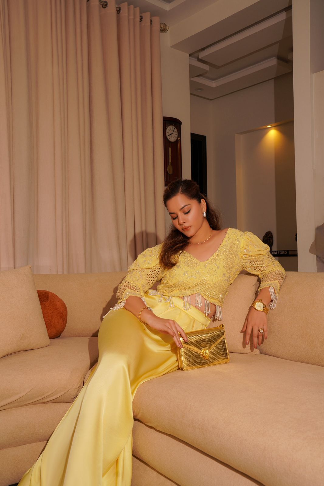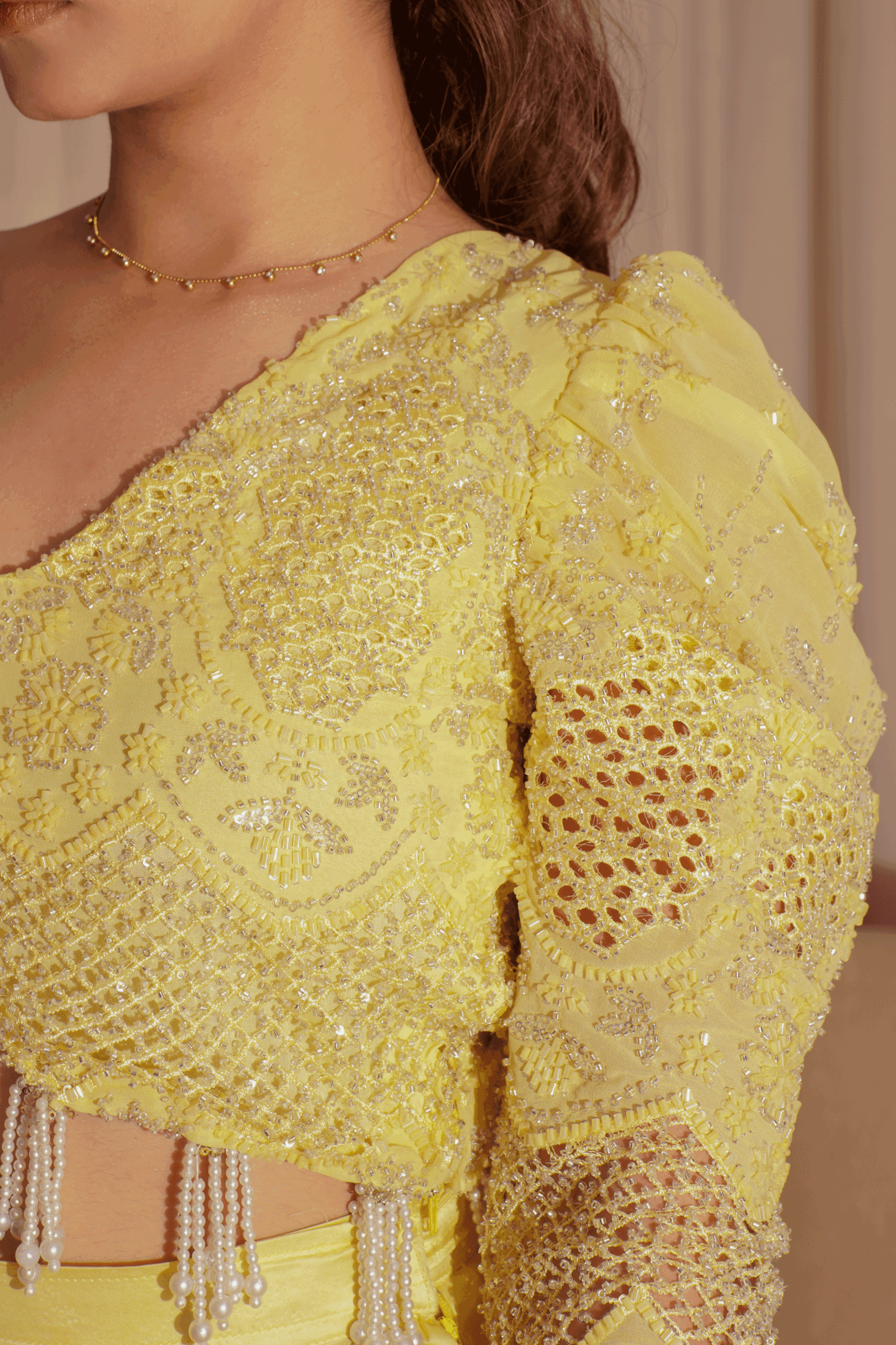 This dazzling occasion-wear ensemble centers on a vibrant butter yellow blouse , completely covered in intricate sequin and bead embellishments forming delicate geometric and floral patterns. The blouse features a sharp V-neckline, dramatic puffy shoulder sleeves, and long arms detailed with large sections of textured, netted lace. A defining feature is the cascading fringe of white pearl tassels adorning the cropped hemline. The top is paired with a high-shine satin skirt in a matching yellow tone, creating a luxurious monochromatic look that is both festive and glamorous, perfectly styled with rich gold accessories.