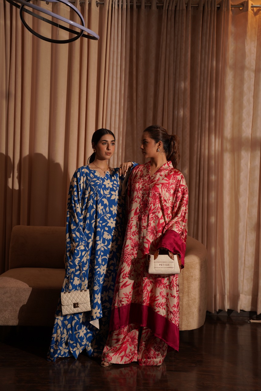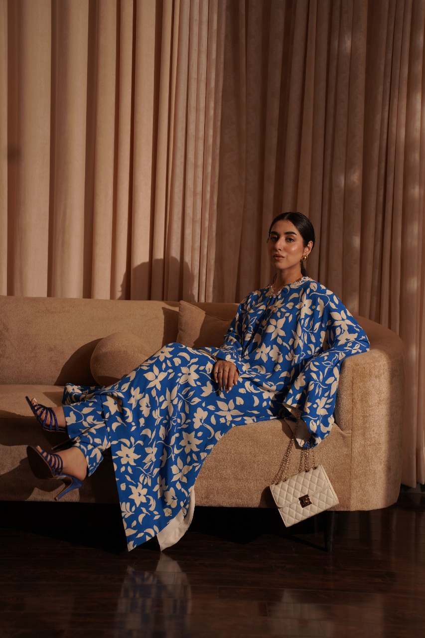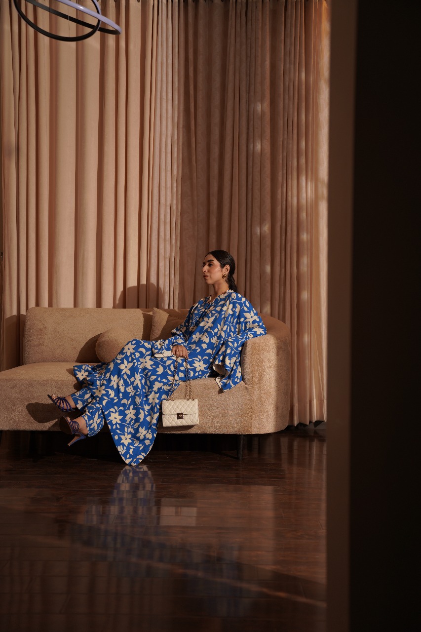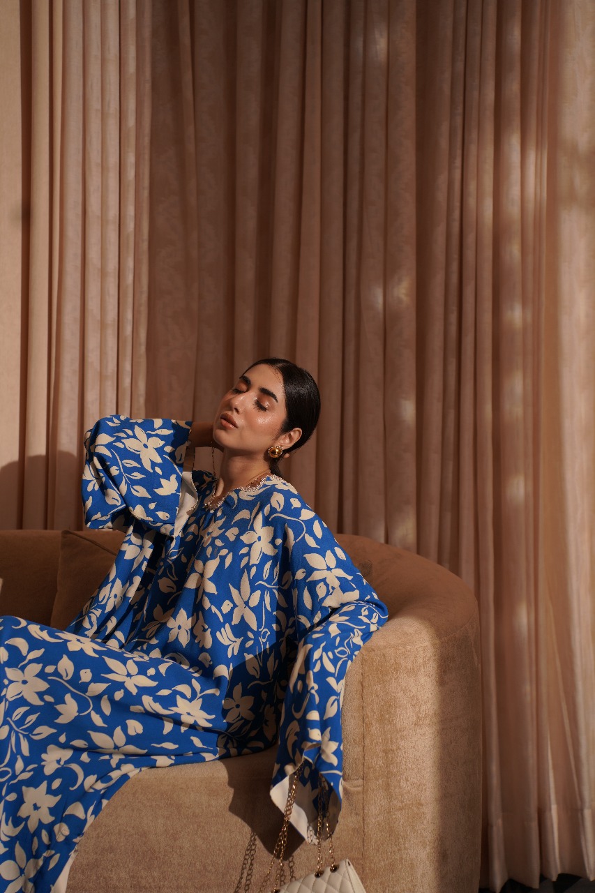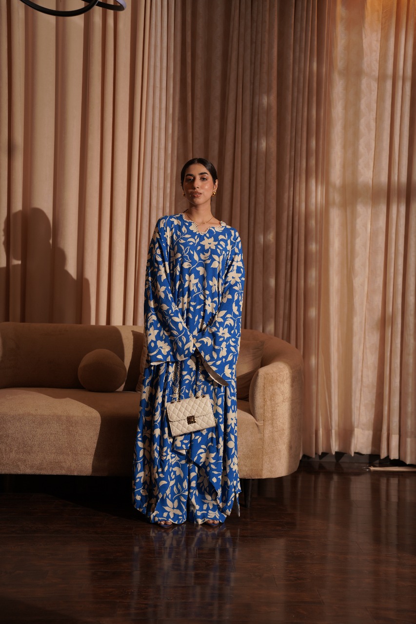 A captivating contrast, this oversized kaftan shirt and pant duo features bold, beautiful cream florals blooming across a deep blue canvas. The loose, fluid fit offers a modern, artful silhouette that moves gracefully with you. Pair it with your favourite accessories for an unforgettable, vibrant look.