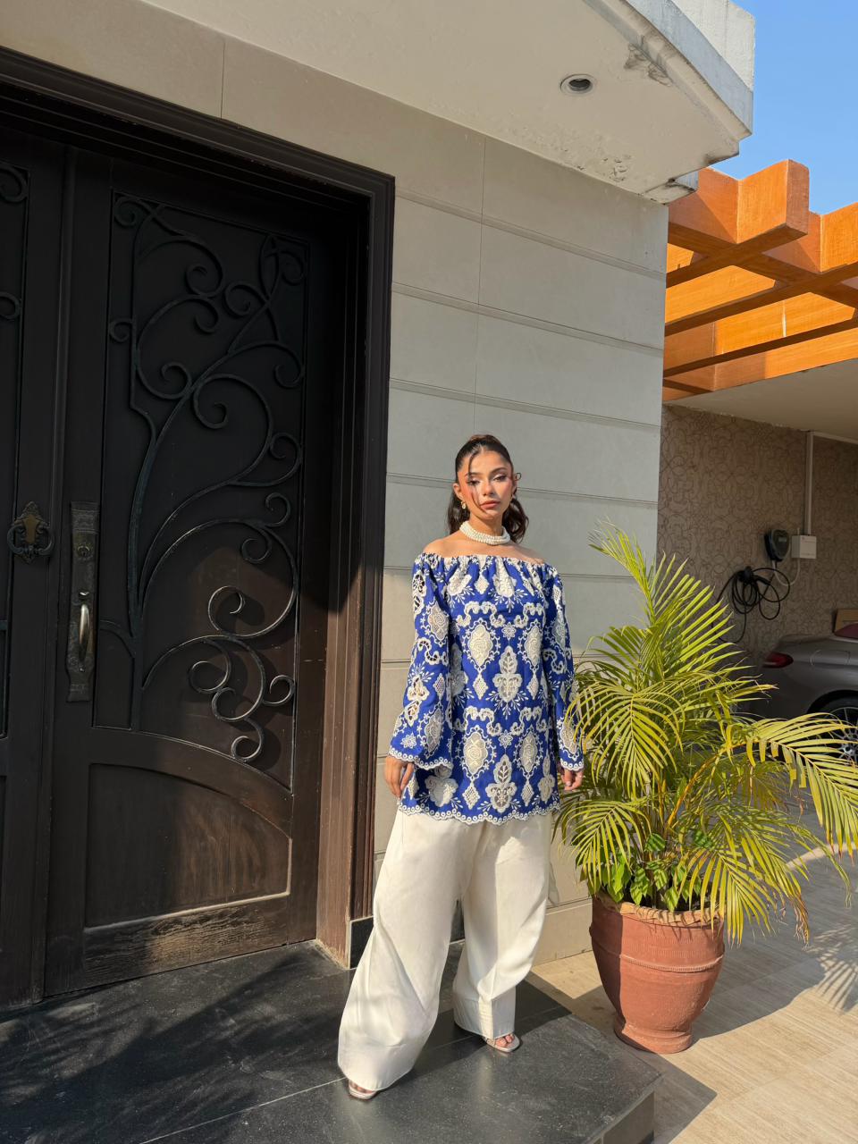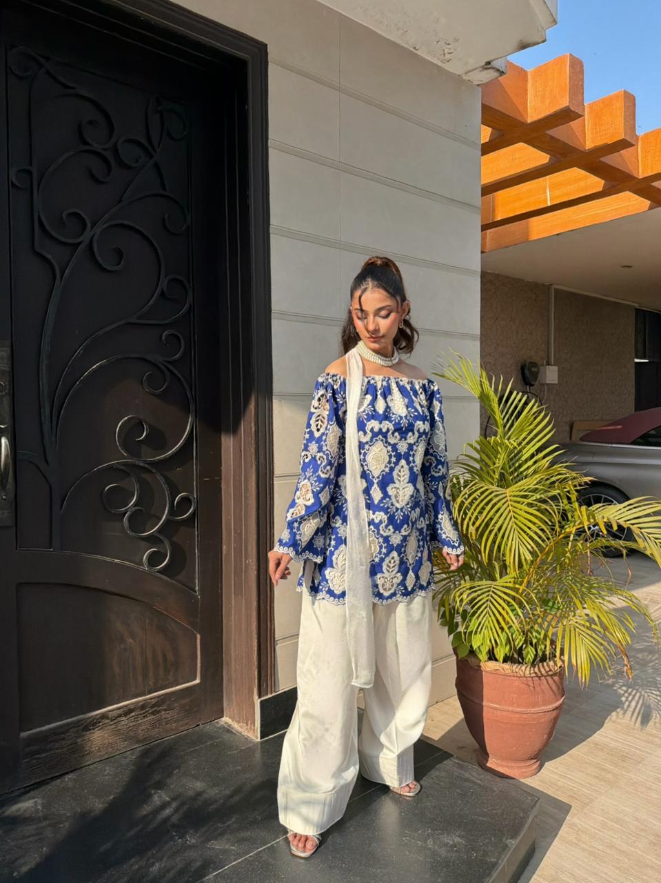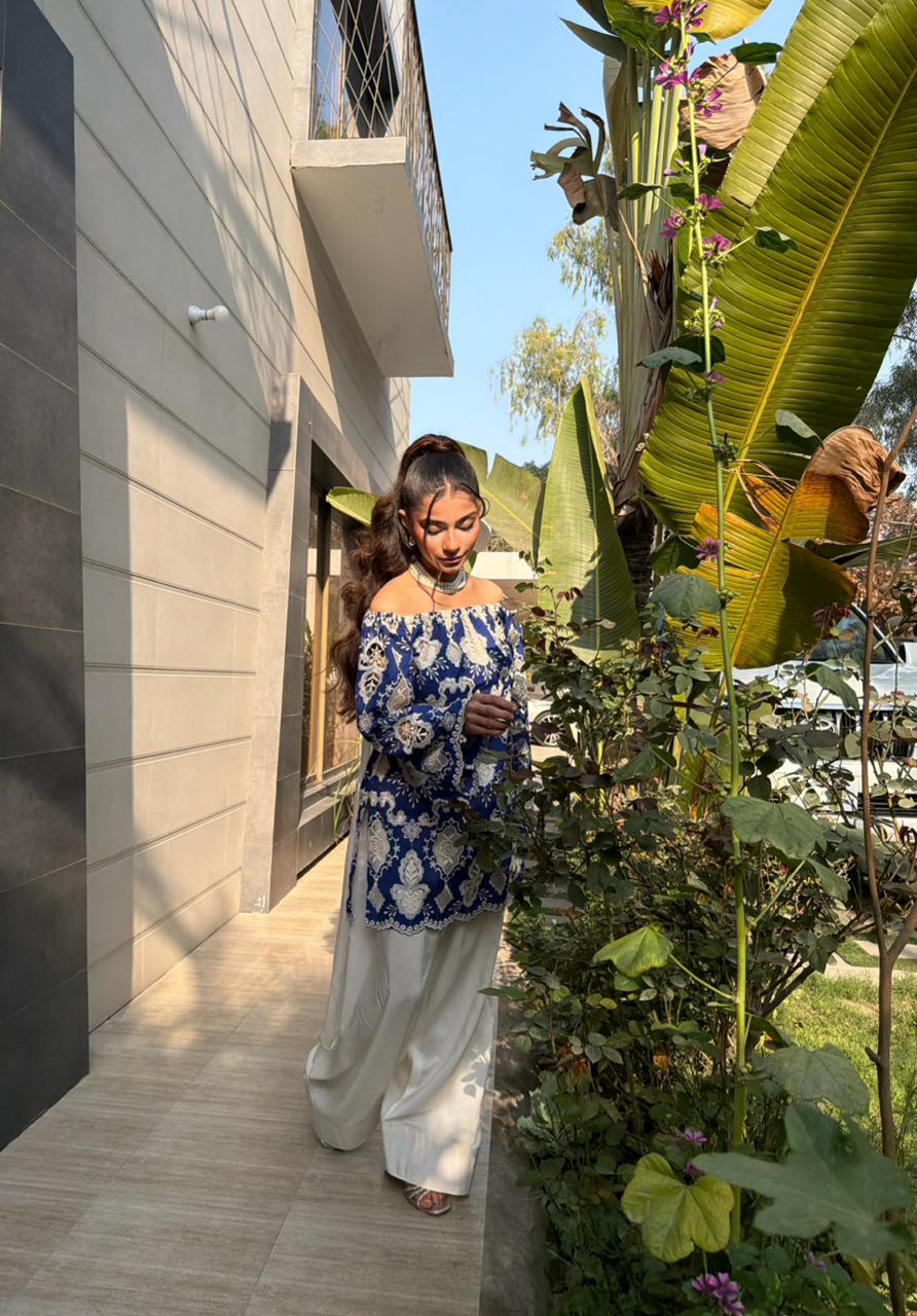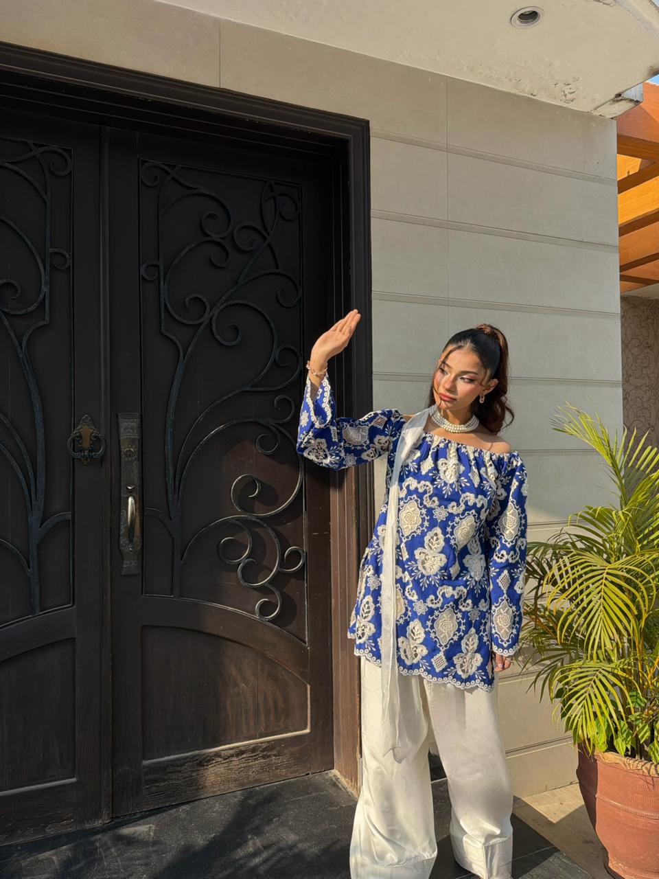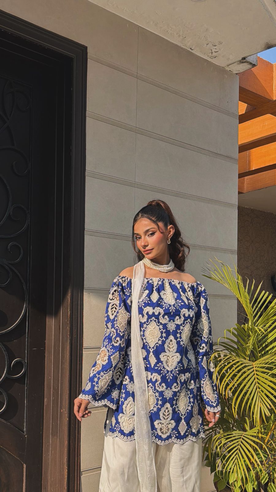 Make a refreshing style statement with this Cobalt Blue & Ivory Set, designed for the modern woman who loves a fusion of classic elegance and contemporary flair. The ensemble features a vibrant royal blue, off-the-shoulder tunic adorned with intricate cream-toned floral embroidery and delicate laser-cut schiffli details that add a light, breathable texture. The silhouette is defined by dramatic flared sleeves and a feminine scalloped hem, perfectly balanced by crisp white farshi shalwar that provide a fluid, statuesque finish. The piece de resistance is the innovative pearl-strand dupatta, expertly styled as a layered choker to create a seamless blend of jewelry and attire, making this the ultimate choice for upscale summer soirées or festive daytime events.