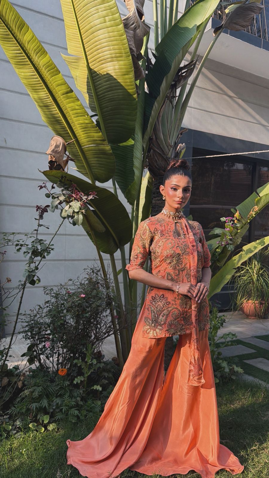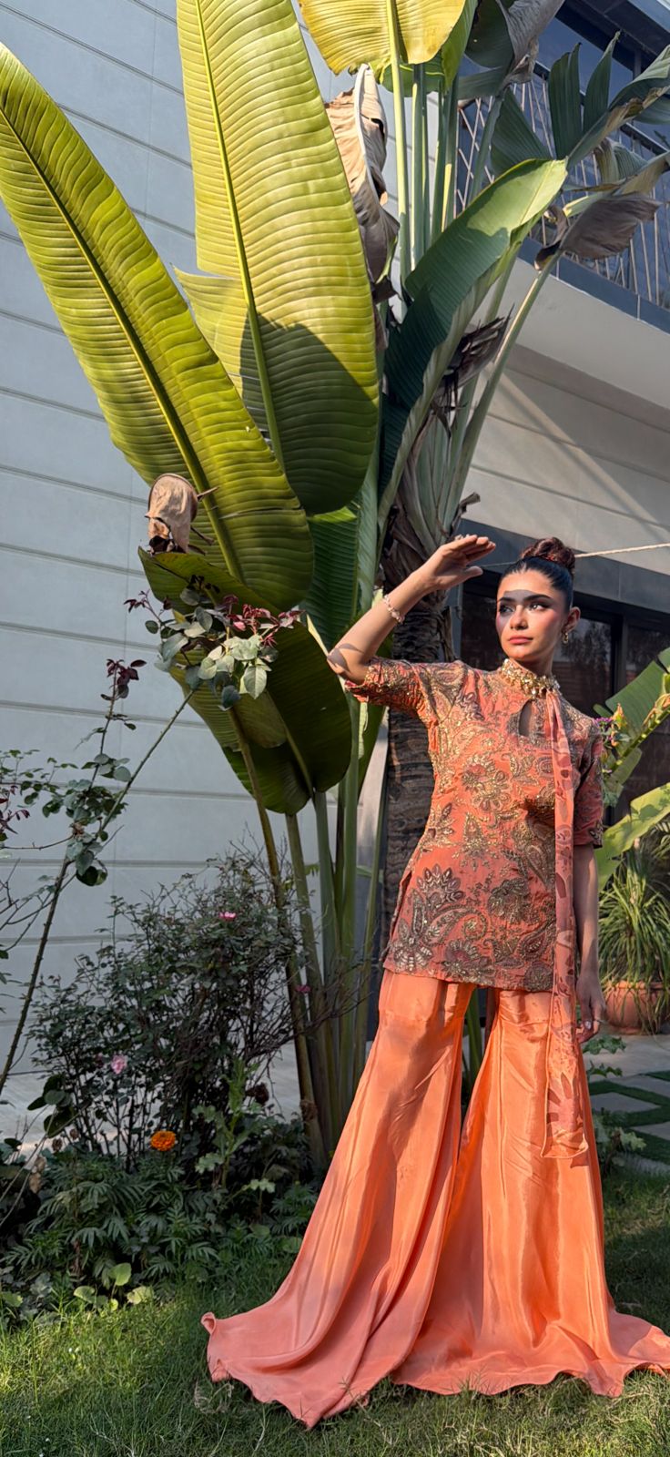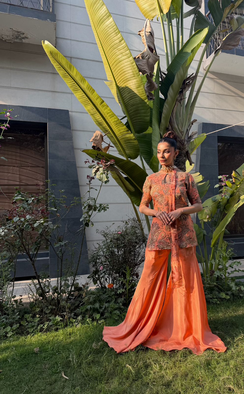 Radiate warmth and high-fashion energy in this Sunset peachy set, a vibrant celebration of color and texture. The short, structured tunic is crafted in a rich coral-peachy hue, adorned with opulent gold tilla and antique bronze paisley embroidery that covers the bodice in a regal, tapestried effect. Designed with a contemporary keyhole neckline and sleek half-sleeves, the top is perfectly balanced by extra-flared silk gharara pants that create a dramatic, flowing movement with every stride. The highlight of this ensemble is the innovative scarf-style dupatta, which is elegantly pre-draped to serve as a jeweled neckpiece, eliminating the need for extra accessories while adding a sophisticated, runway-ready finish.