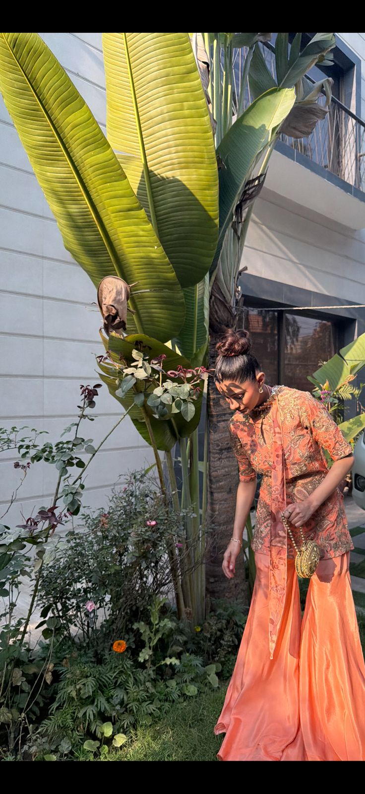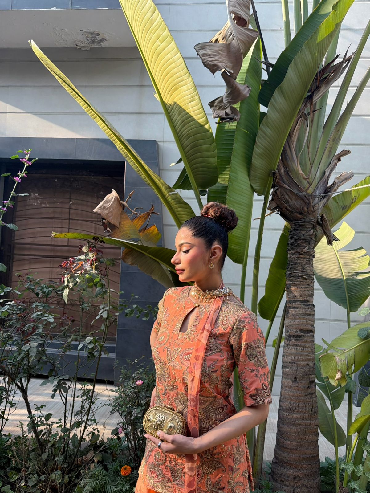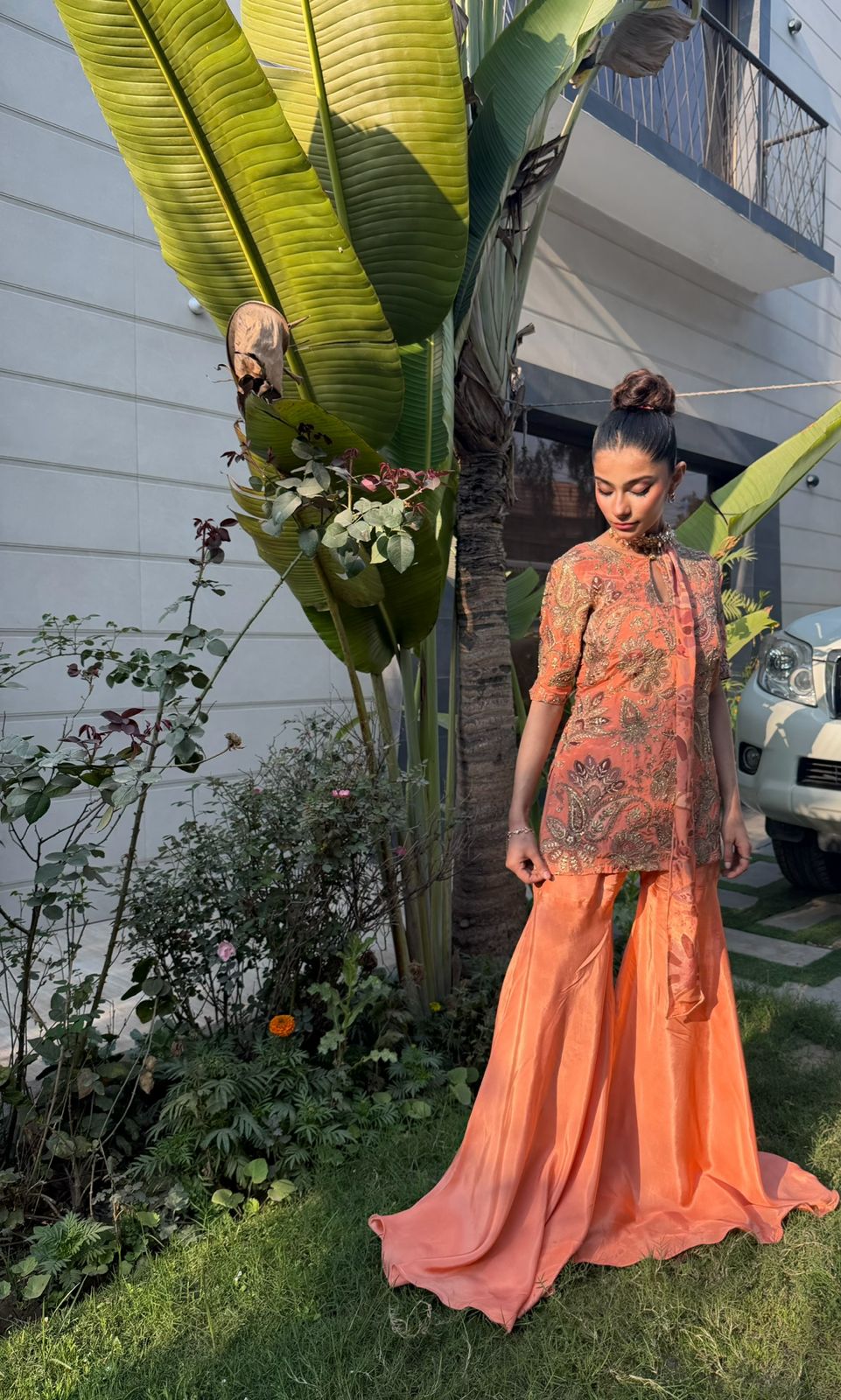 Radiate warmth and high-fashion energy in this Sunset peachy set, a vibrant celebration of color and texture. The short, structured tunic is crafted in a rich coral-peachy hue, adorned with opulent gold tilla and antique bronze paisley embroidery that covers the bodice in a regal, tapestried effect. Designed with a contemporary keyhole neckline and sleek half-sleeves, the top is perfectly balanced by extra-flared silk gharara pants that create a dramatic, flowing movement with every stride. The highlight of this ensemble is the innovative scarf-style dupatta, which is elegantly pre-draped to serve as a jeweled neckpiece, eliminating the need for extra accessories while adding a sophisticated, runway-ready finish.